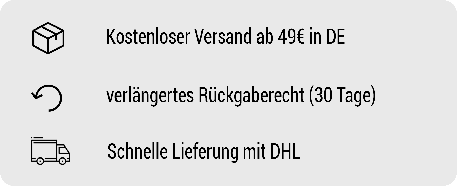Du hast die Möglichkeit, unsere Produkte 30 Tage lang unverbindlich zu tragen. Dank unseres vereinfachten Retourensystems kannst Du die Artikel stressfrei zurückgeben und erhältst eine vollständige Rückerstattung deines Geldes.